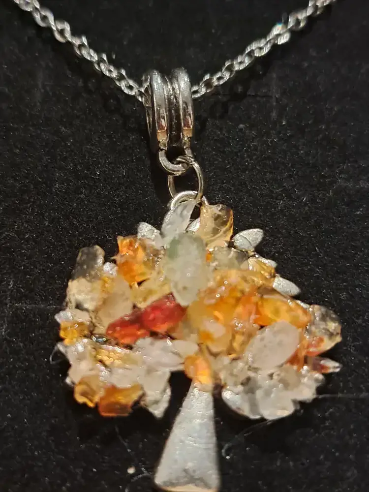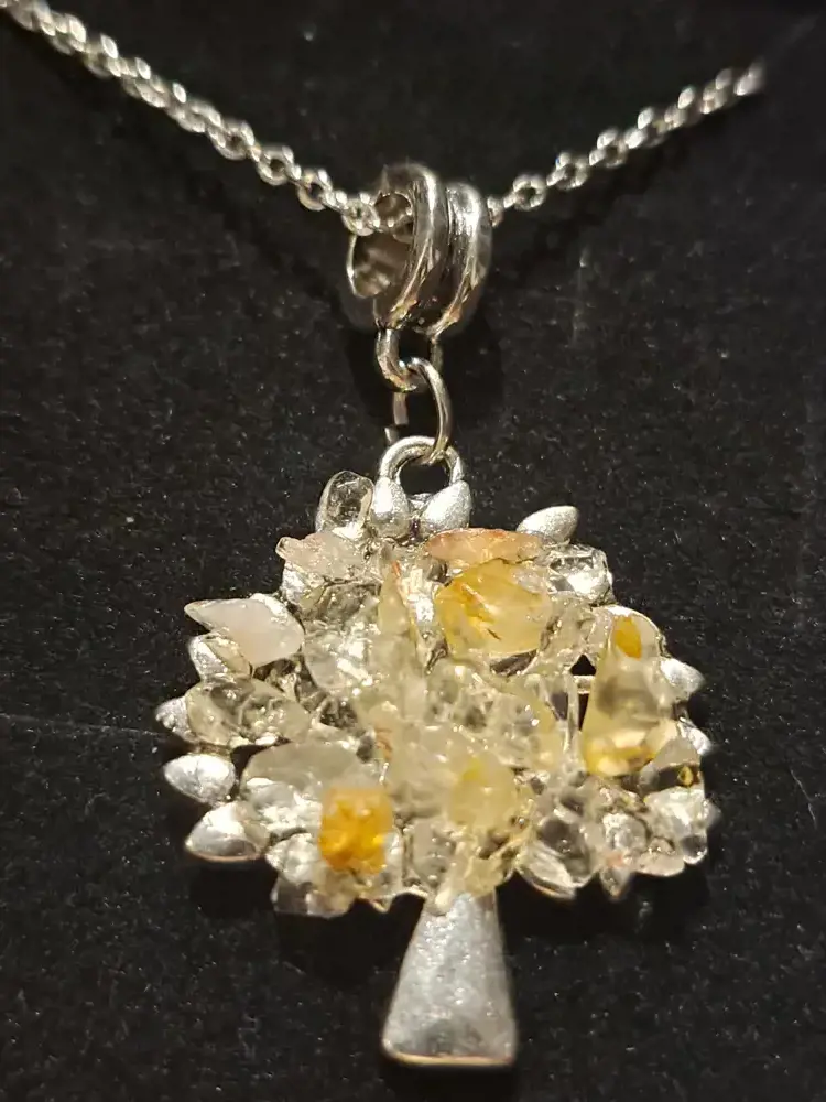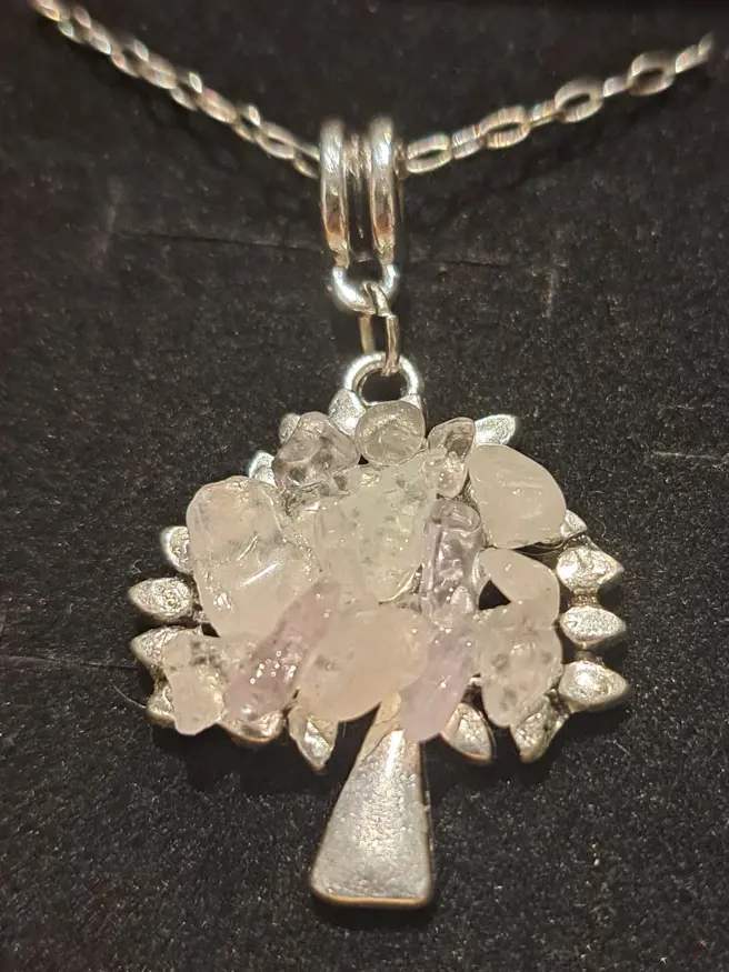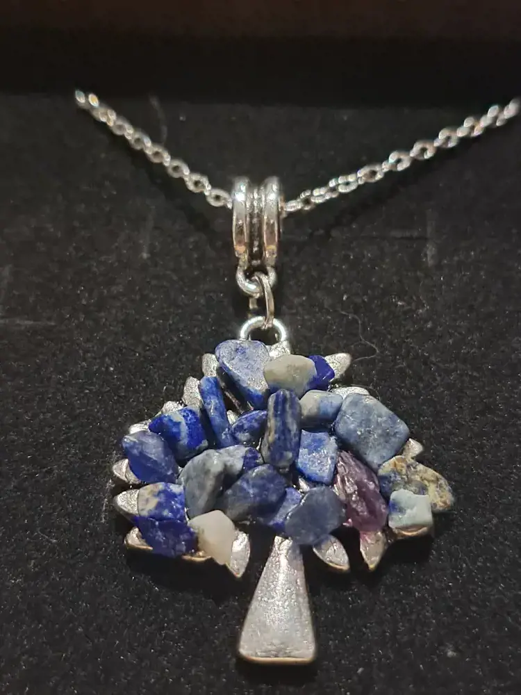 Chaîne argent, fermoir métal argenté, sans nickel, sans cadmium, sur bélière, arbre de vie pierres gemmes.46/47cm, modèle variable.