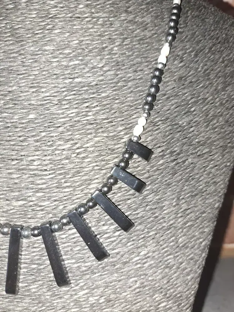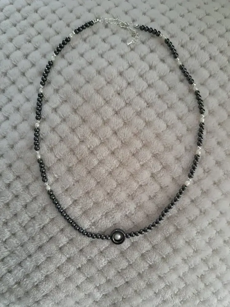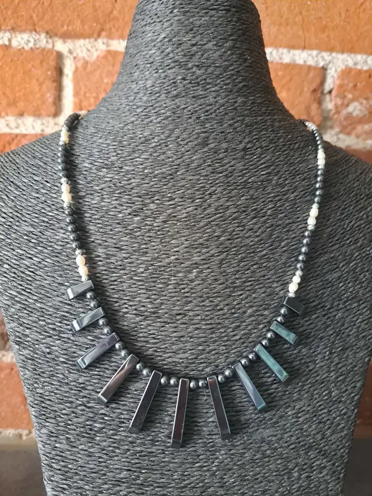 - Collier FEMME, en hématite et perle nacrée très chic, pièce unique artisanale