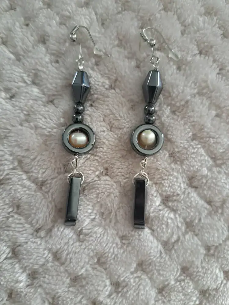 DESCRIPTION : très jolie paire de boucle d'oreilles à porter en pendentif, de fabrication artisanale, en pierre naturelle d'hématite non aimantée, ornée d'une perle nacrée, pièce unique, chic et glamour.