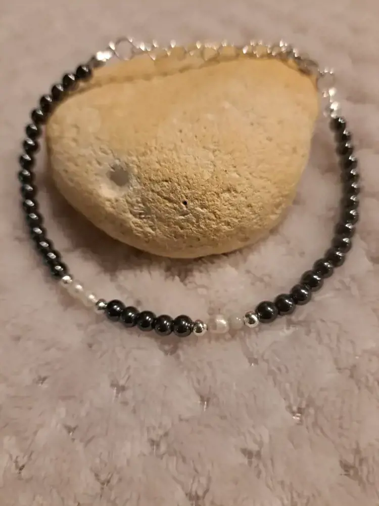 Bracelet raffiné et discret en hématite et perle, pièce unique, artisanal.