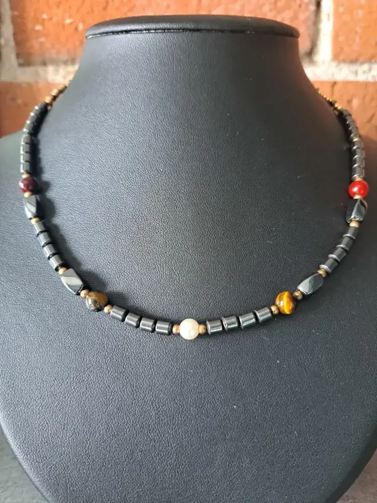 Gemme : hématite véritable non aimantée, une perle nacrée, cornaline, œil de tigre, grenat rouge