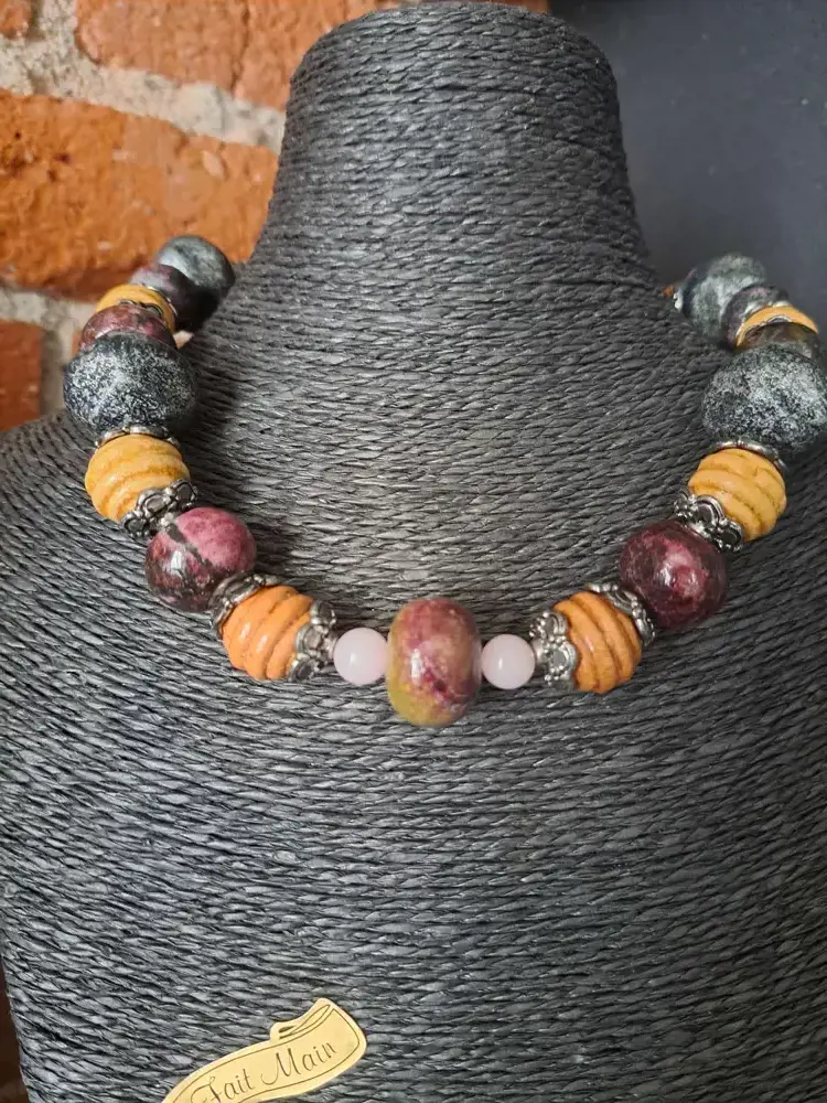 Collier UNAKITE , quartz rose, Article fait main, pièce unique