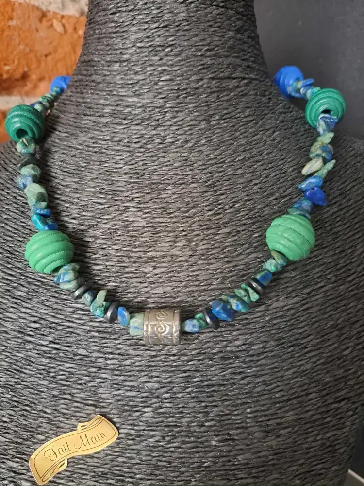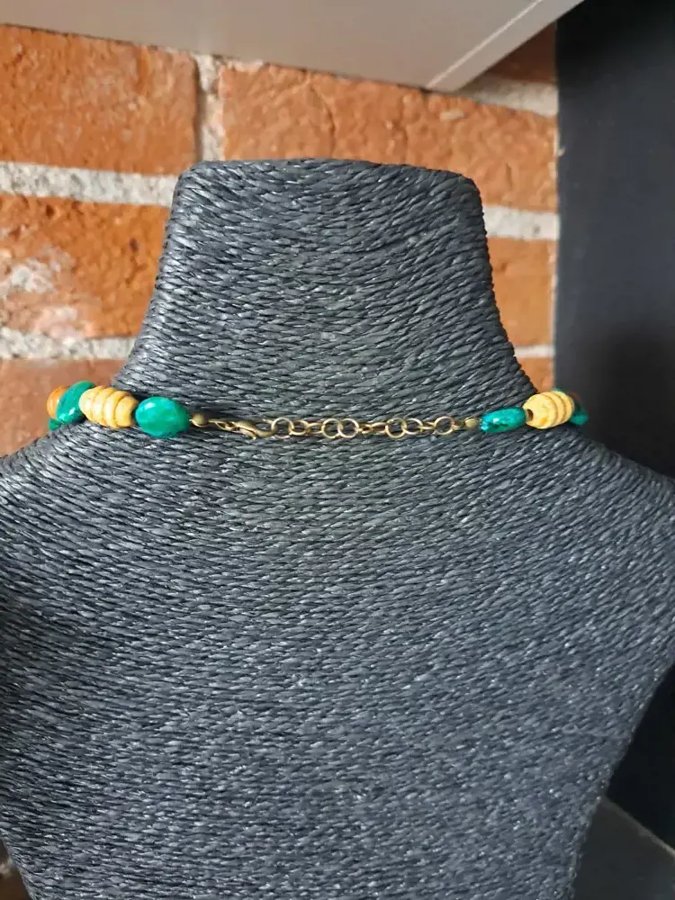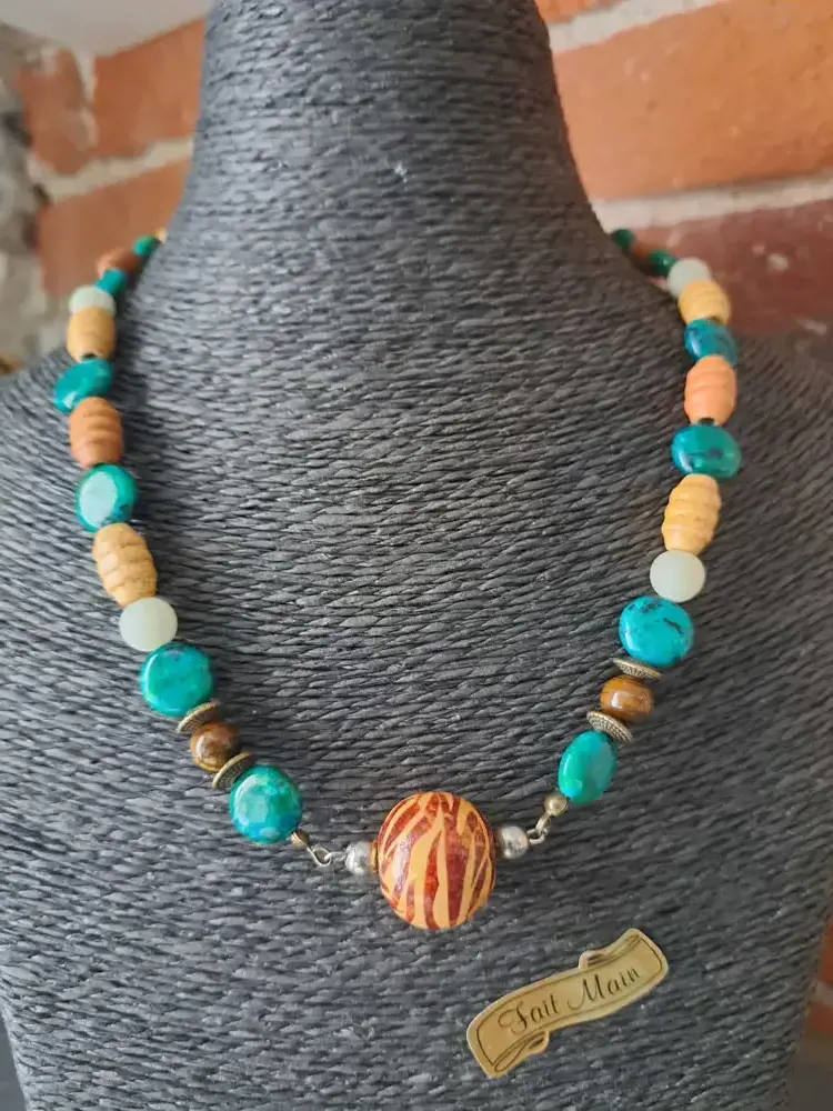 Matériaux : acier, Gemme, chrysocolle malachite teintée, autre perle bois teintée bois clair et vert, grosse perle bois zébrée, 2 perles œil du tigre, perle intercalaire gravées en métal or vieilli Tibet, 4 perles d'amazonite