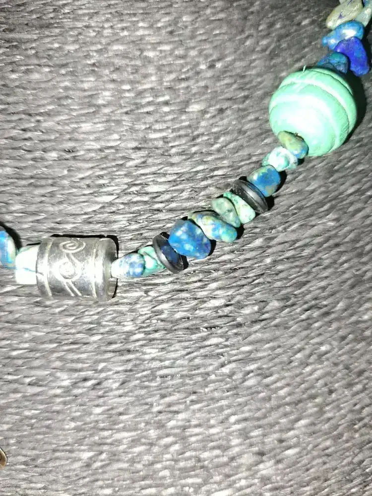 Matériaux : acier, Gemme, autre perle bois teintée bleu et vert perle intercalaire tambour, gravée en métal argent antique