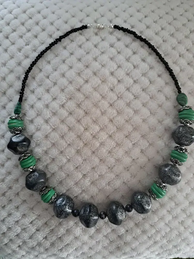 Perle artificielle : 2 perles plates ovales imitation malachite, perle de rocaille noir, grosse et petite perles grise métallisée