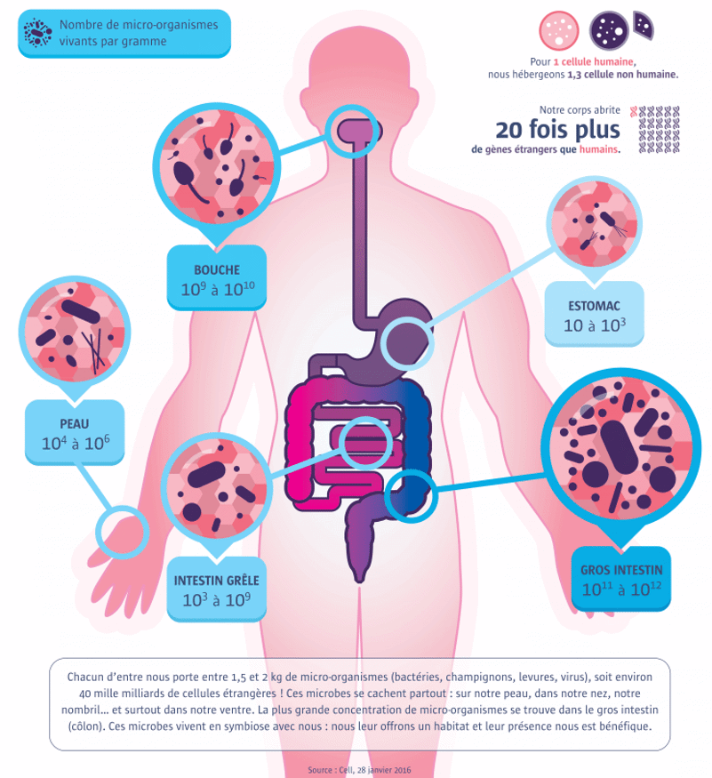 Chez l’humain, il en existe plusieurs, au niveau de la peau, de la bouche, du vagin, etc. Le microbiote intestinal est le plus important d'entre eux, avec 100 000 milliards de micro-organismes, autant que le nombre de cellules qui constituent notre corps.