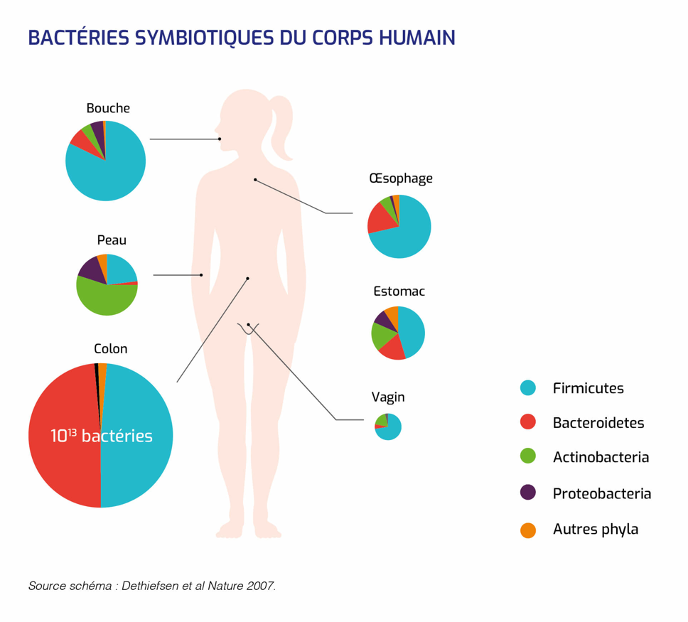 En effet, le corps humain abrite plusieurs microbiotes différents, chacun ayant une composition bactérienne unique. Les microbiotes se trouvent dans la bouche, la gorge, le nez, la peau, le vagin et tout le tube digestif.
